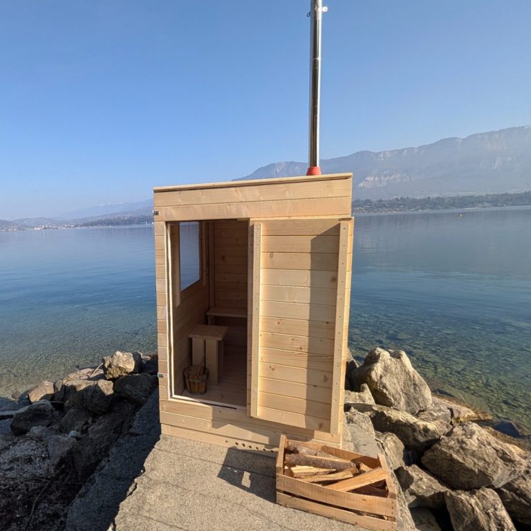 La boite chaude Premium avec parois en bois naturel à l'intérieur et saturée à l'extérieur, isolation du toit pour une montée en température plus rapide, une sur-toiture en couvertine anthracite pour un toit chic et étanche. Poêle à bois, un banc et deux tabourets intérieurs. Finition des joints à la corde. Pour une mise en place en extérieur jusqu'à plusieurs semaines.