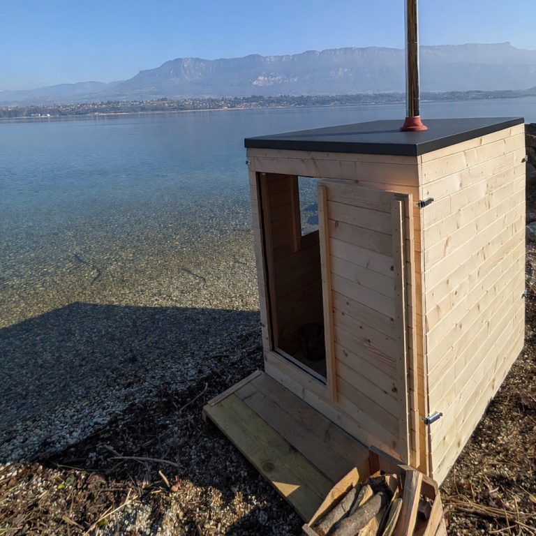 La boite chaude Zen avec parois en bois naturel, poêle à bois, un banc intérieur, toit bois. Usage : montage et rangement à chaque utilisation.